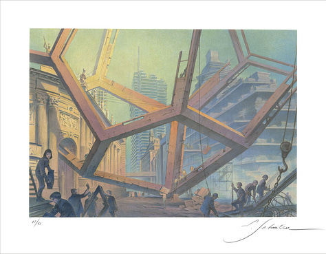 HS: Le travail de François Schuiten n'est pas seulement agréable à l'œil, il est aussi profond. Cela est dû en partie aux scénarios forts avec lesquels il travaille ou dont il s'inspire. Ses œuvres peuvent ainsi évoquer l'époque de l'Art nouveau ou Jules Vernes, et ses dessins Esher ou Piranèse, avec même des touches de Caravage dans ses clairs-obscurs. Sur le plan du contenu, il s'agit de "l'homme universel", dans sa quête, ses doutes, son errance dans un monde kafkaïen, sa grandeur et son héroïsme mais aussi sa petitesse et ses doutes existentiels. Son œuvre est tellement actuelle, surtout dans Drang - Compulsion, qu'elle met en lumière et magnifie les activités humaines. Nous sommes sans cesse en quête de quelque chose, le plus souvent de quelque chose de matériel, ce qui nous fait perdre de vue l'essentiel dans le présent... et ce, alors que nous sommes des poussières d'étoiles.